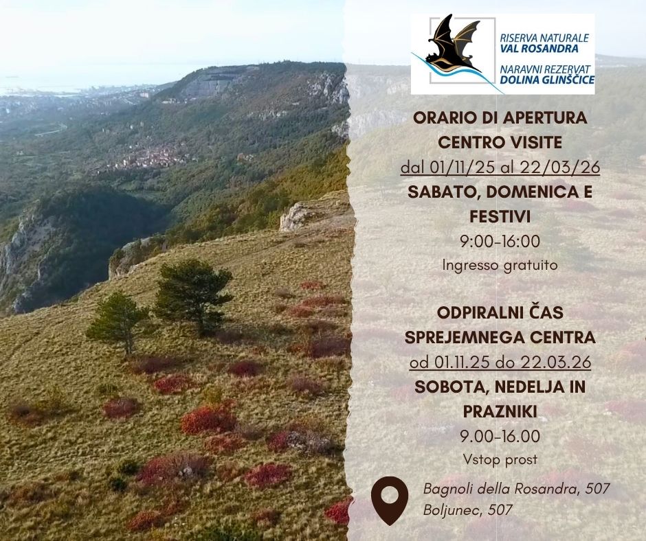 Dal 1. novembre 2025 si passa all'orario invernale del Centro visite, che sarà così aperto ogni sabato, domenica e festivi dalle 9:00 alle 16:00, Natale 25 dicembre escluso.